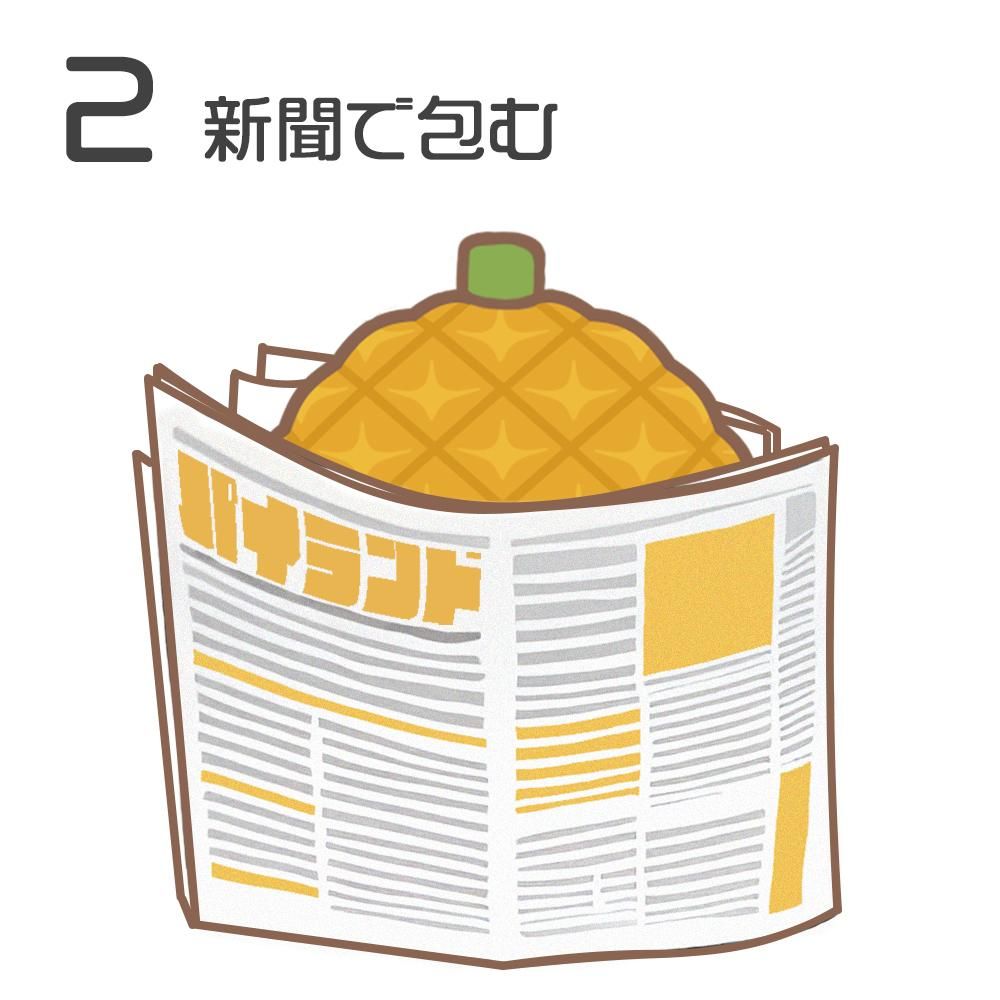 頭の葉をカットして新聞を巻き パインの頭側を下にして、 可能であれば野菜室で保存してください。(2~3日保存可能)